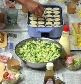 当日、職員が準備をしていると、野菜を切る音につられ子どもたちも集まり、すでに「おいしそう~!」の大歓声。それぞれが好きに具材を入れ、作るたこ焼きはとても美味しかったようで「まだいける!まだ食べれる!」とたくさん食べていました。
