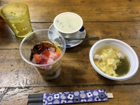 夕食のカップ寿司は普段はあまり食べられない刺身を前にテンションは最高潮‼キレイにご飯と具材を重ね、「アボカドとサーモンを合わせて~」と自分だけのカップ寿司を作っていました。☺